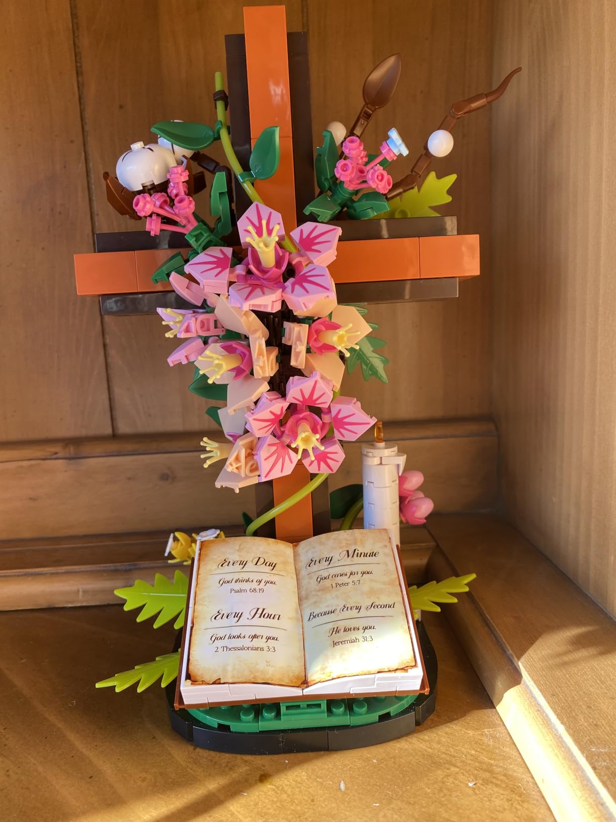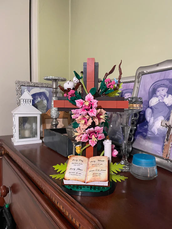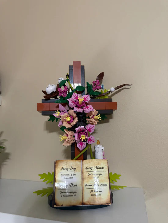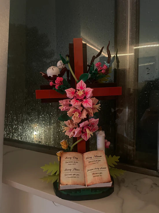 This set includes 589 individual building bricks that come together to create a beautifully detailed wooden-style cross decorated with pink lilies, green leaves, a candle, and an open Holy Bible at the base. It also comes with a step-by-step instruction manual and arrives in a gift ready box, perfect for faith filled family moments or meaningful Christian gifts.