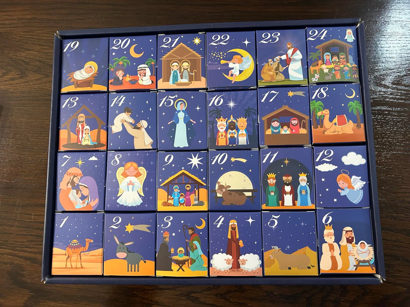 The calendar includes 24 individually boxed mini brick sets. Each day reveals a new piece of the Nativity story, from the stable and animals to Mary, Joseph, baby Jesus, and more.